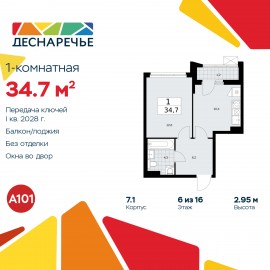 Однокомнатная квартира в ЖК "Деснаречье" на 6 этаже. Квартира без отделки, после выдачи ключей можно делать ремонт. Общая площадь: 34.7 кв.м., жилая: 12.6 кв.м., площадь просторной кухни-столовой: 10.4 кв.м. Все окна выходят на одну сторону. В квартире одна лоджия, один совмещенный...