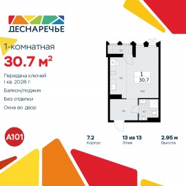 1-комн. квартира-студия в ЖК "Деснаречье" на 13 этаже. Квартира без отделки, полностью готова к ремонту. Общая площадь: 30.7 кв.м., площадь гостиной 20.5 кв.м., из которых 5.9 кв.м. выделено под кухонную зону. Все окна выходят на одну сторону. В квартире одна лоджия, один совмещенный...