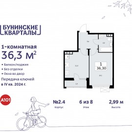 Однокомнатная квартира в ЖК "Бунинские кварталы" на 6 этаже. Квартира без отделки, после оформления собственности можно делать ремонт. Общая площадь: 36.5 кв.м., жилая: 14.1 кв.м., площадь просторной кухни-столовой: 11.4 кв.м. Все окна выходят на одну сторону. В квартире одна лоджия,...