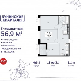 Просторная трехкомнатная квартира бизнес-класса с европланировкой и отделкой в ЖК "Бунинские кварталы" на 18 этаже. Общая площадь: 56.9 кв.м., жилая: 34.4 кв.м., общая площадь гостиной-столовой с кухонной зоной: 14.4 кв.м. Европланировка, зона гостиной комнаты объединена с кухней....