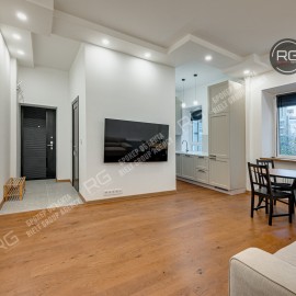 Арт. 79767234. Квартира с качественным ремонтом в современном классическом стиле в ЖК "Дом на Смоленской набережной". Планировка: просторная кухня, гостиная, две спальни с гардеробными и ванными комнатами, прихожая с гардеробной, постирочная. Квартира оборудована мебелью и...