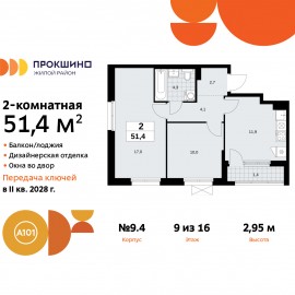 Просторная двухкомнатная квартира с отделкой в ЖК "Прокшино" на 9 этаже. Общая площадь: 51.4 кв.м., жилая: 27 кв.м., площадь просторной кухни-столовой: 11.9 кв.м. Угловая квартира, очень светлая, естественная вентиляция при открытии окон. В квартире одна лоджия, один совмещенный...