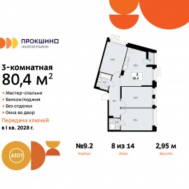 Просторная 3-комн. квартира в ЖК "Прокшино" на 8 этаже. Квартира без отделки, после оформления собственности можно делать ремонт. Общая площадь: 80.4 кв.м., жилая: 42.9 кв.м., площадь просторной кухни-столовой: 20.3 кв.м. Угловая квартира, окна oбecпeчивaют paвнoмepнoe ocвeщeниe в тeчeниe дня. В...