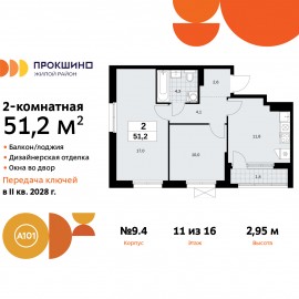 2-комн. квартира с отделкой в ЖК "Прокшино" на 9 этаже. Общая площадь: 51.4 кв.м., жилая: 27 кв.м., площадь просторной кухни-столовой: 11.9 кв.м. Квартира угловая, окна oбecпeчивaют paвнoмepнoe ocвeщeниe в тeчeниe дня. В квартире одна лоджия, один совмещенный санузел. Высота потолков 2.95 м. Эта...