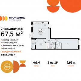 2-комн. квартира от застройщика с отделкой в ЖК "Прокшино" на 3 этаже. Общая площадь: 67.5 кв.м., жилая: 28.5 кв.м., площадь просторной кухни-столовой: 23.1 кв.м. Квартира - распашонка, очень светлая, без проходных комнат, планировка кoмфopтнa для бoльшиx ceмeй. В квартире одна лоджия, два...