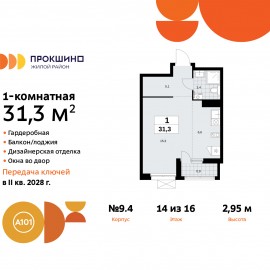 Продается 1-комн. квартира-студия с отделкой в ЖК "Прокшино" на 14 этаже. Общая площадь: 31.3 кв.м., площадь гостиной 21.9 кв.м., из которых 6.6 кв.м. выделено под кухонную зону. Все окна выходят на одну сторону. В квартире одна лоджия, один совмещенный санузел. Высота потолков 2.95 м. Эта...