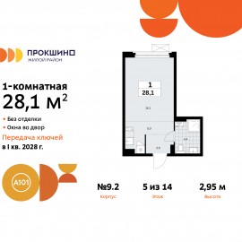 Продается 1-комн. квартира-студия в ЖК "Прокшино" на 5 этаже. Квартира без отделки, после получения ключей можно делать ремонт. Общая площадь: 28.1 кв.м., площадь гостиной 21.1 кв.м., из которых 5 кв.м. выделено под кухонную зону. Все окна выходят на одну сторону. В квартире один...