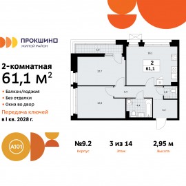 Двухкомнатная квартира от застройщика в ЖК "Прокшино" на 3 этаже. Квартира без отделки, после оформления собственности можно делать ремонт. Общая площадь: 61.1 кв.м., жилая: 25.5 кв.м., площадь просторной кухни-столовой: 18.1 кв.м. Угловая квартира, очень светлая, естественная...