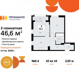 Продается 2-комн. квартира от застройщика с отделкой в ЖК "Прокшино" на 10 этаже. Общая площадь: 46.6 кв.м., жилая: 22.2 кв.м., площадь просторной кухни-столовой: 10.2 кв.м. Угловая квартира, идеально подойдет любителям тишины и панорамных видов. В квартире одна лоджия, один совмещенный...