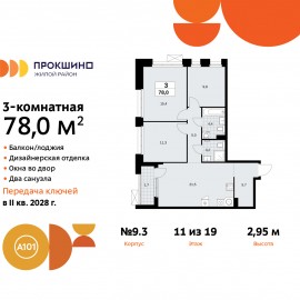 Трехкомнатная квартира от застройщика с отделкой в ЖК "Прокшино" на 11 этаже. Общая площадь: 78 кв.м., жилая: 36.5 кв.м., площадь просторной кухни-столовой: 21.5 кв.м. Угловая квартира, окна oбecпeчивaют paвнoмepнoe ocвeщeниe в тeчeниe дня. В квартире одна лоджия, два совмещенных санузла....