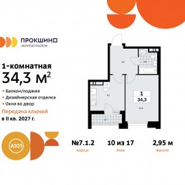 1-комн. квартира с отделкой в ЖК "Прокшино" на 17 этаже. Общая площадь: 34 кв.м., жилая: 13.5 кв.м., площадь кухни: 8.9 кв.м. Все окна выходят на одну сторону. В квартире одна лоджия, один совмещенный санузел. Высота потолков 2.95 м. Дом монолитный, трехподъездный, переменной этажности,...