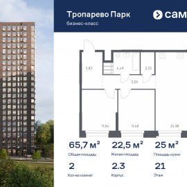 Строим кварталы для жизни с заботой о будущем. Предлагаются 2-комнатные апартаменты бизнес-класса 65, 74 кв.м в корпусе 2.3 на 21 этаже, в МФК «Тропарево Парк» Апартаменты с чистовой отделкой. Доступность дополнительных опций уточняйте у застройщика. Прописка не предусмотрена...