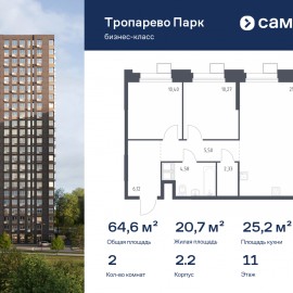 Строим кварталы для жизни с заботой о будущем. Предлагаются 2-комнатные апартаменты бизнес-класса 64, 58 кв.м в корпусе 2.2 на 11 этаже, в МФК «Тропарево Парк» Апартаменты с чистовой отделкой. Доступность дополнительных опций уточняйте у застройщика. Прописка не предусмотрена...