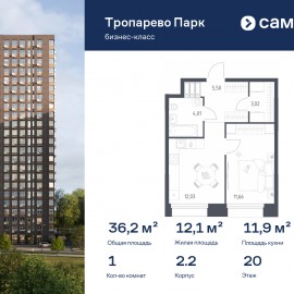 Строим кварталы для жизни с заботой о будущем. Предлагаются 1-комнатные апартаменты бизнес-класса 36, 22 кв.м в корпусе 2.2 на 20 этаже, в МФК «Тропарево Парк» Апартаменты без отделки. Доступность опции «отделка» и возможность комплектации мебелью и декором уточняйте у...