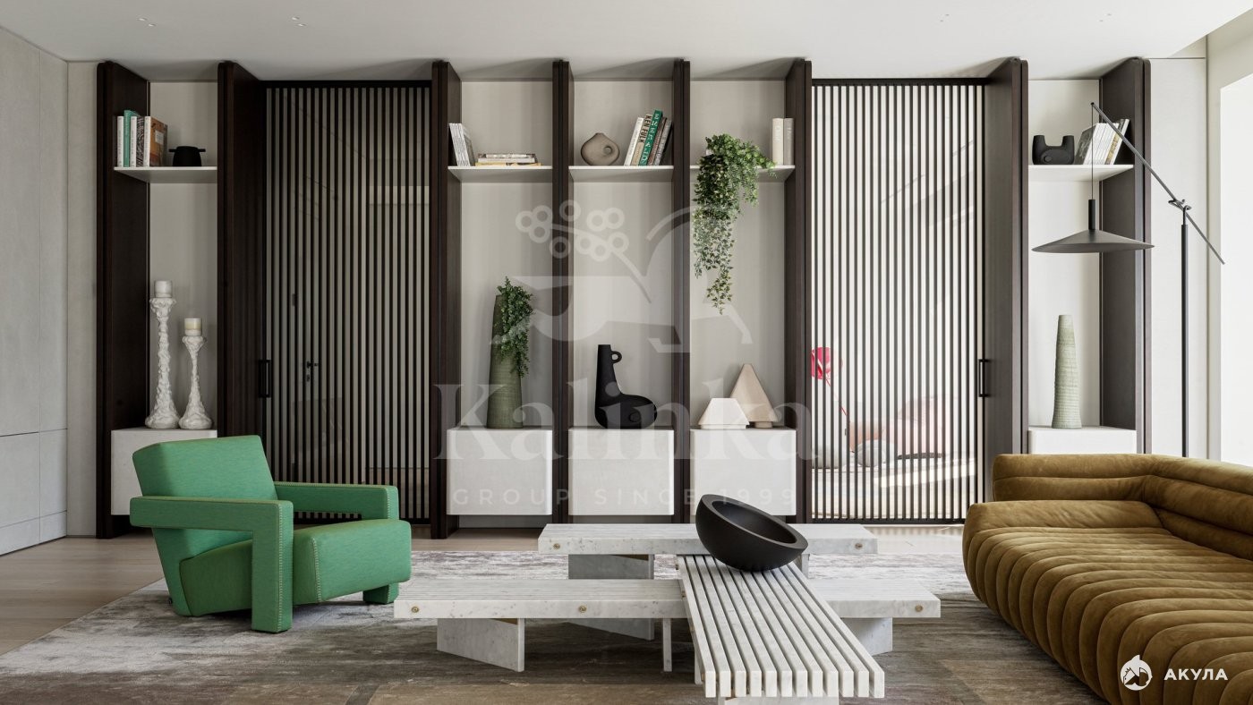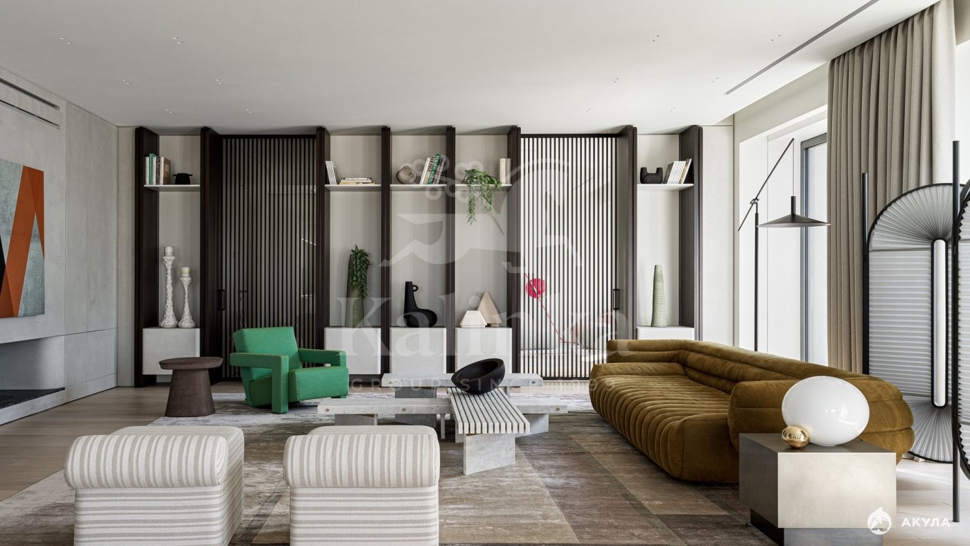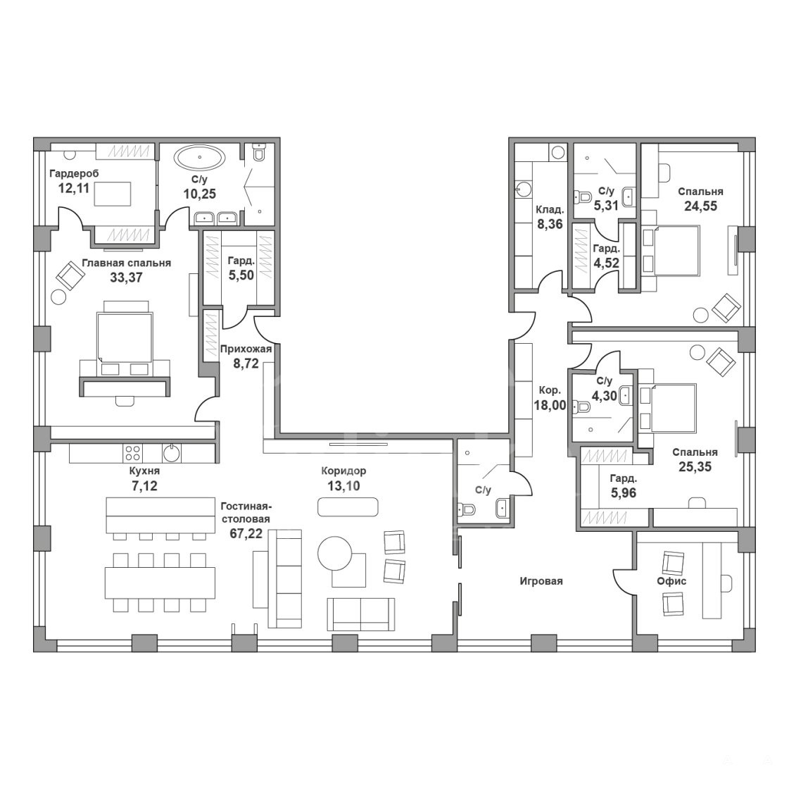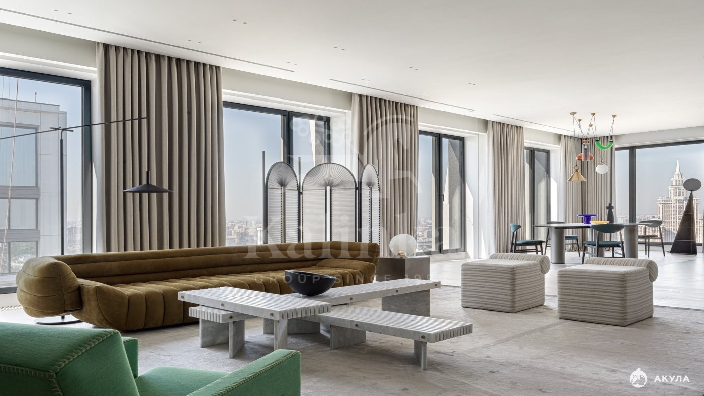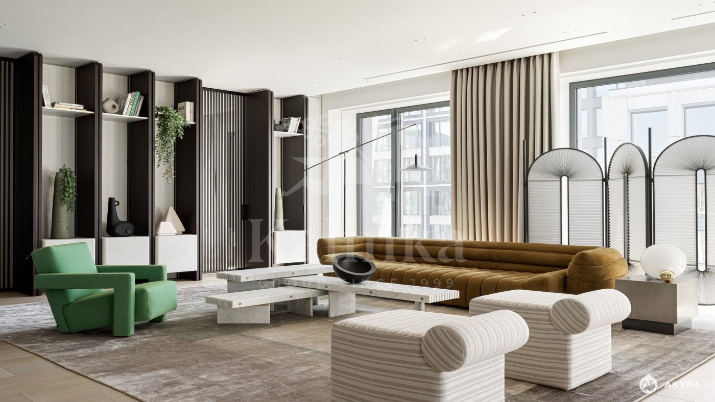 Площадь 287 кв. м разделена на две зоны с индивидуальными входами. Детская зона включает две детские спальни, в каждой из которых есть санузел и вместительная гардеробная, светлая и просторная игровая комната, которую можно использовать как дополнительную спальню, а также комнату для занятий. Вторая зона — это мастер-спальня с большой гардеробной и собственным санузлом, а также великолепная стильная гостиная, гармонично объединенная с кухней и столовой. В квартире реализована самая современная инженерия, включая систему приточно-вытяжной вентиляции с забором и фильтрацией воздуха, а также центральную систему кондиционирования с увлажнением.