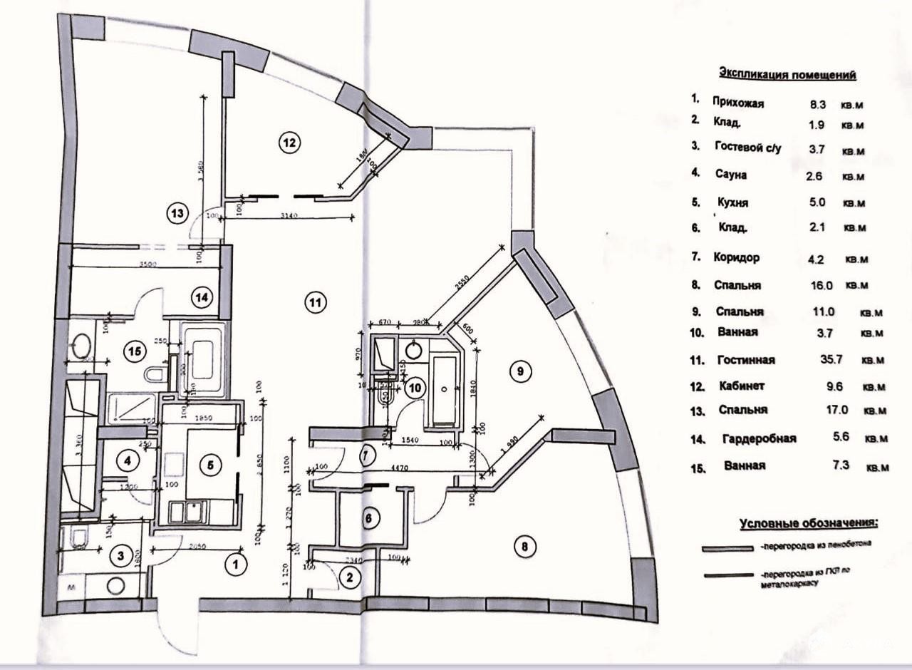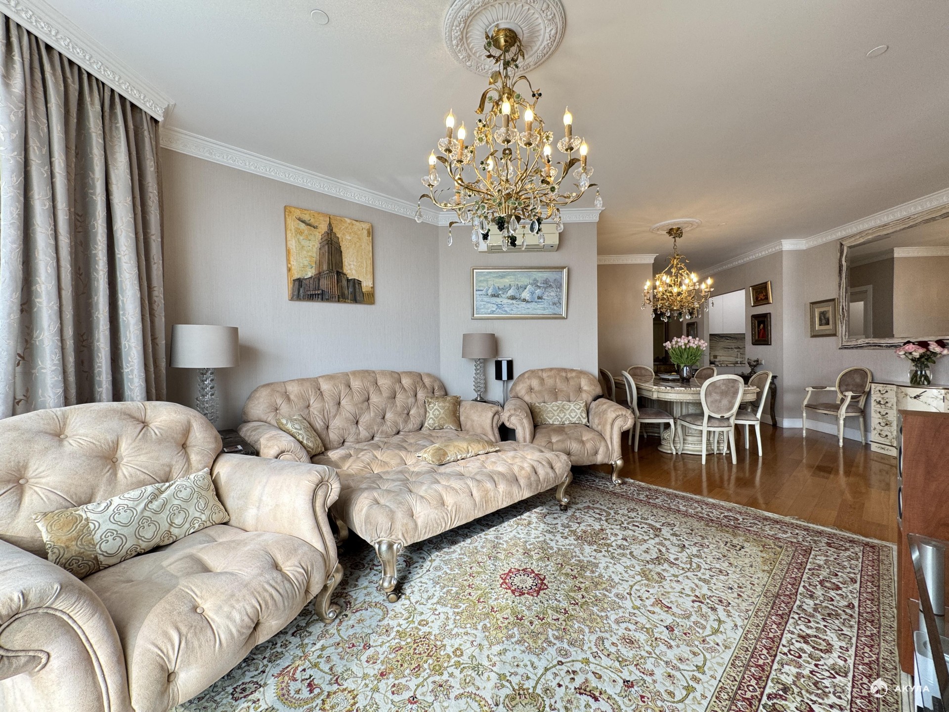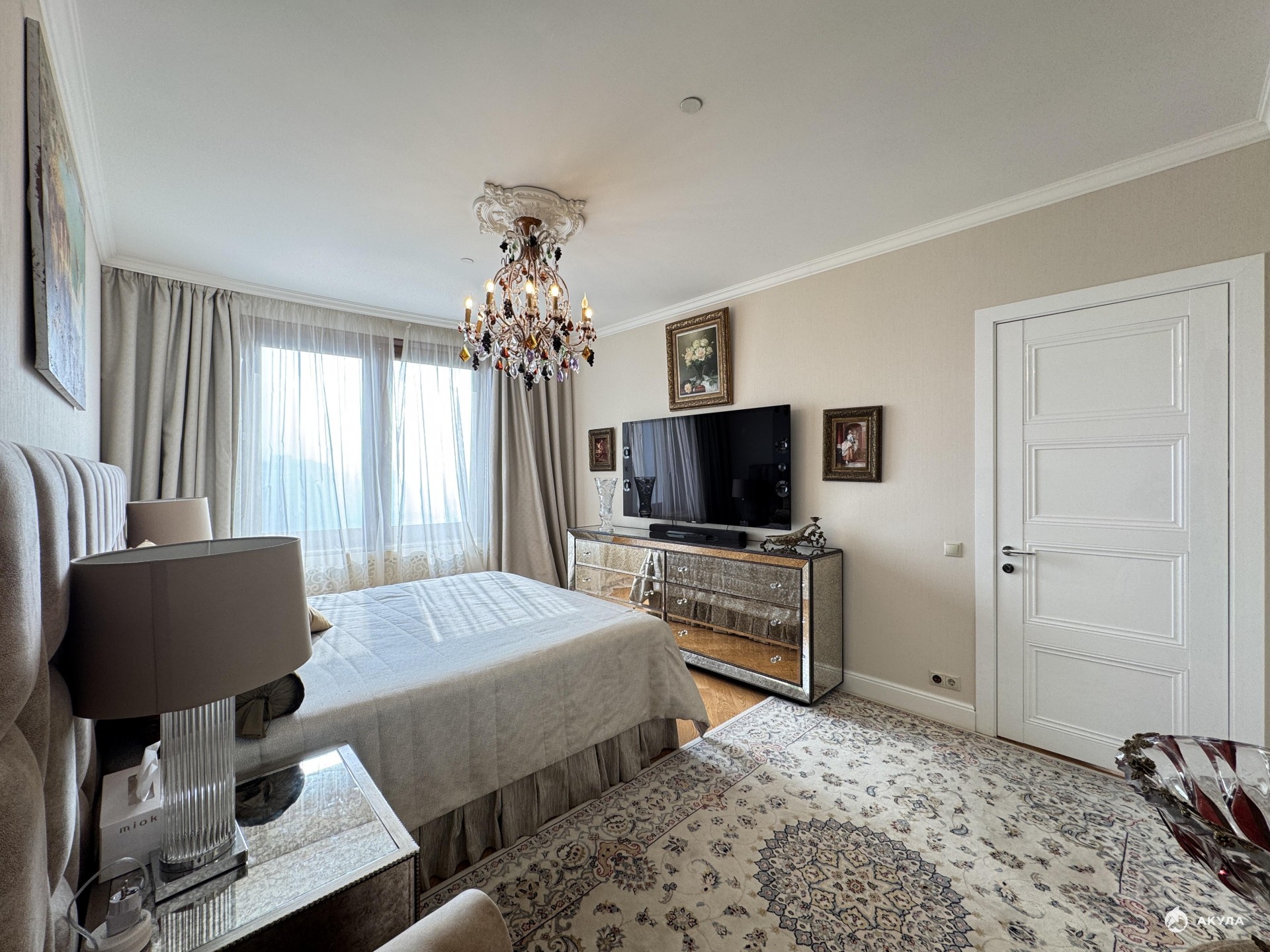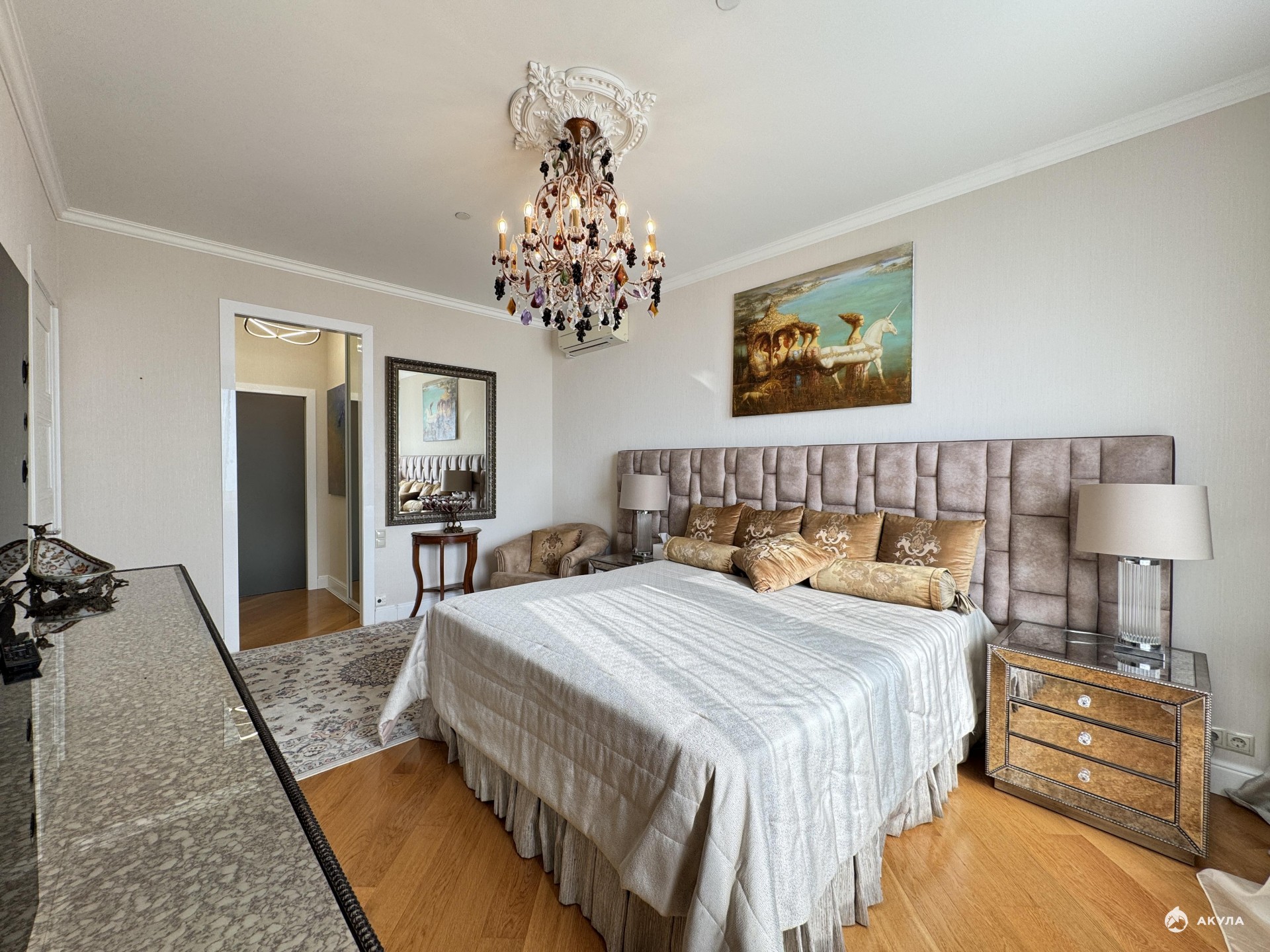 Планировка квартиры включает в себя: просторную гостиную-столовую с выделенной кухонной зоной, четыре спальни, три полноценных санузла с душевыми кабинами, кладовые комнаты, гардеробные и шкафы для хранения.