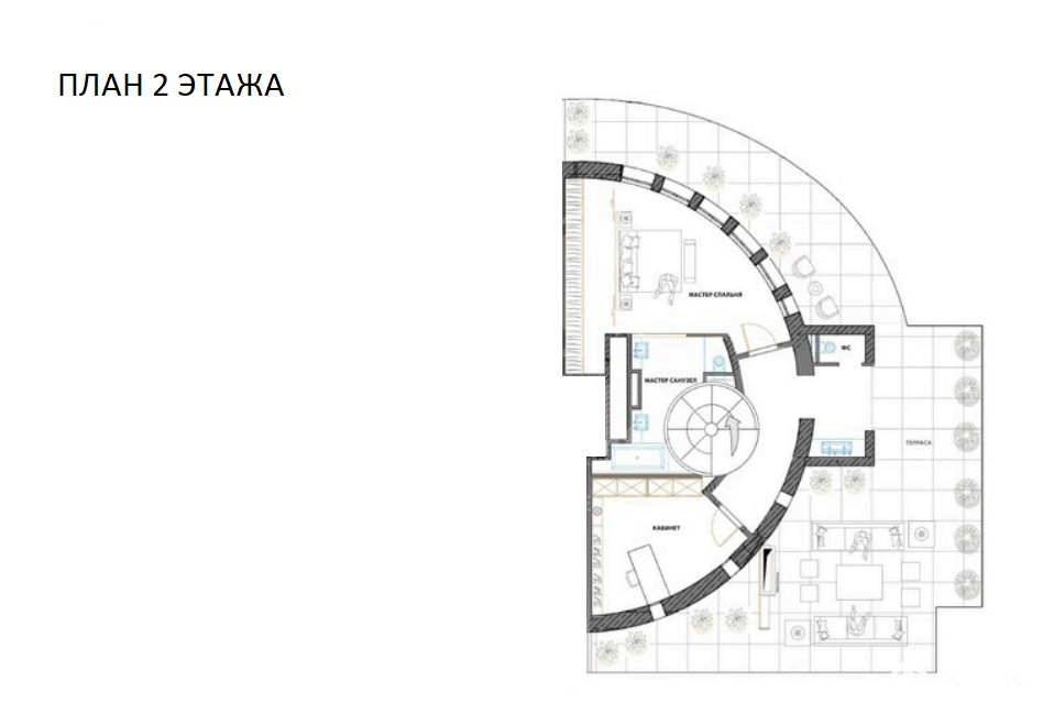 Дизайн-проектом предложен один из вариантов планировки: гостиная, кухня, столовая, кабинет, две спальни с ванными комнатами и третья мастер-спальня на втором уровне. Сервисная кухня при выходе на террасу.