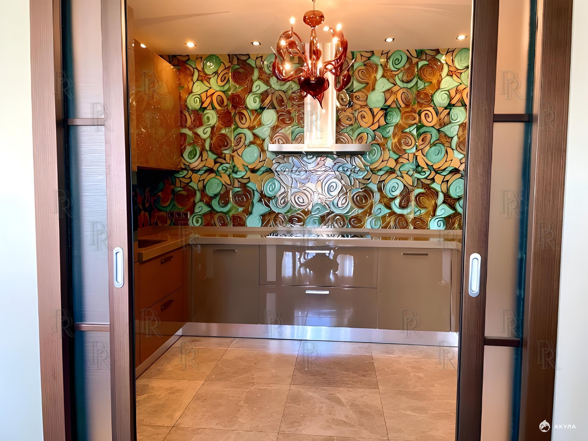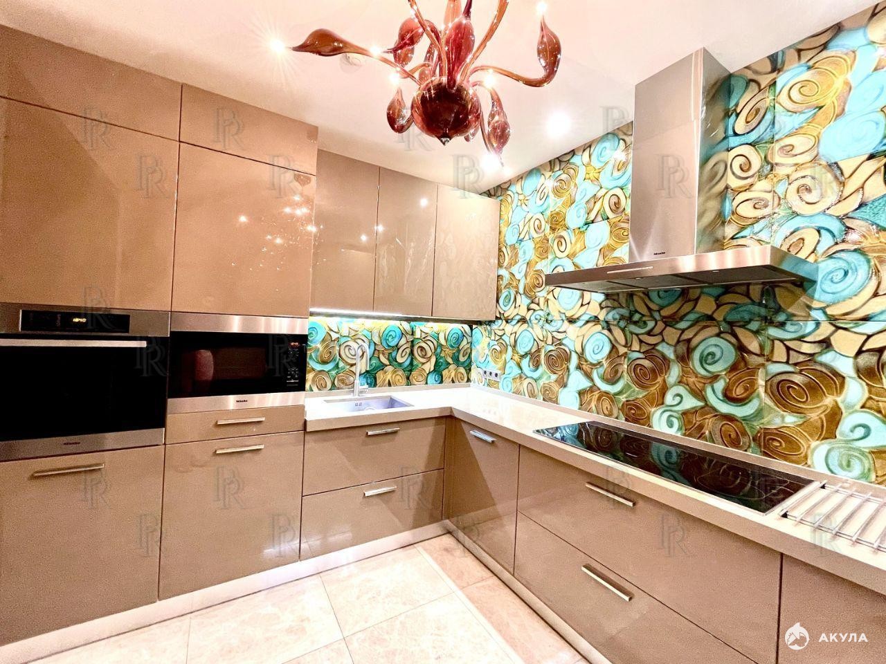Кухонный гарнитур укомплектован всей необходимой бытовой техникой, в санузлах установлена сантехника премиальных брендов. Напольное покрытие: мрамор и паркет.