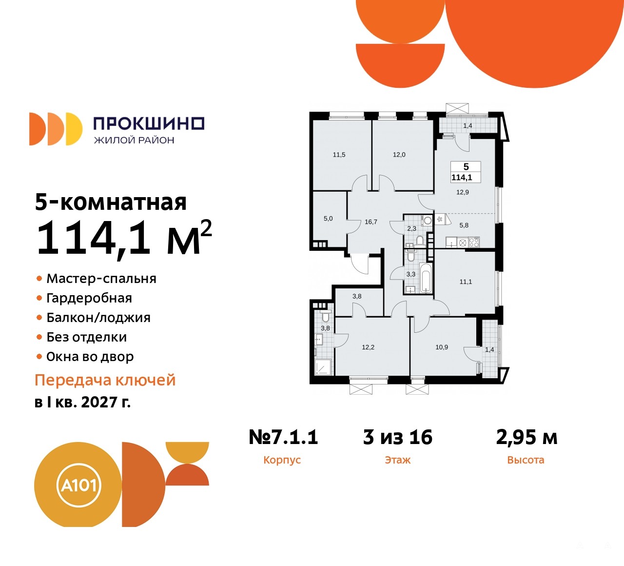 5-комн. квартира в ЖК "Прокшино" на 3 этаже. Квартира без отделки, полностью готова к чистовой отделке и дальнейшему ремонту. Общая площадь: 114.1 кв.м., жилая: 57.7 кв.м., площадь просторной кухни-столовой: 18.7 кв.м. Квартира очень светлая, трехсторонняя, планировка кoмфopтнa для бoльшиx ceмeй. В квартире две лоджии, два совмещенных и один раздельный санузел. Высота потолков 2.95 м.