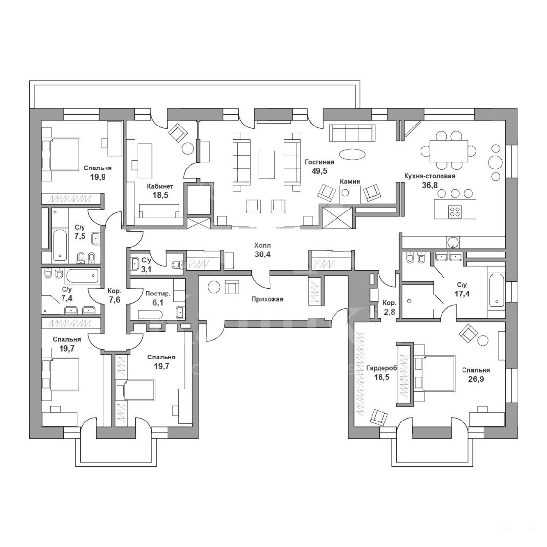 Возможности планировки: 4-5 спален, кабинет, гостиная с каминной зоной, кухня-столовая, постирочная, 4 с/узла.