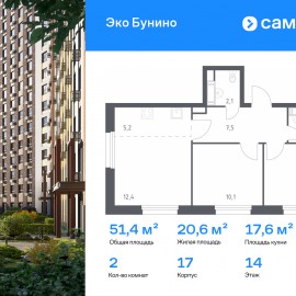 Строим кварталы для жизни с заботой о будущем. Предлагается 2-комнатная квартира комфорт-класса 51, 4 кв.м в корпусе 17 на 14 этаже, в ЖК «Эко Бунино» Квартира без отделки. Доступность опции «отделка» и возможность комплектации мебелью и декором уточняйте у...