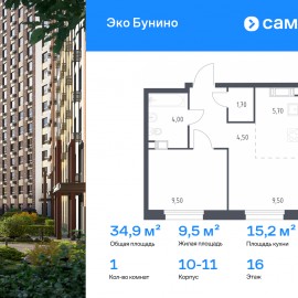 Строим кварталы для жизни с заботой о будущем. Предлагается 1-комнатная квартира комфорт-класса 34, 9 кв.м в корпусе 10-11 на 16 этаже, в ЖК «Эко Бунино» Квартира без отделки. Доступность опции «отделка» и возможность комплектации мебелью и декором уточняйте у...