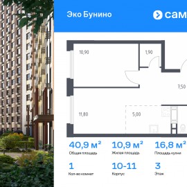 Строим кварталы для жизни с заботой о будущем. Предлагается 1-комнатная квартира комфорт-класса 40, 9 кв.м в корпусе 10-11 на 3 этаже, в ЖК «Эко Бунино» Квартира без отделки. Доступность опции «отделка» и возможность комплектации мебелью и декором уточняйте у...