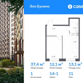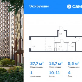 Строим кварталы для жизни с заботой о будущем. Предлагается 1-комнатная квартира комфорт-класса 37, 7 кв.м в корпусе 10-11 на 4 этаже, в ЖК «Эко Бунино» Квартира без отделки. Доступность опции «отделка» и возможность комплектации мебелью и декором уточняйте у...