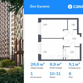 Строим кварталы для жизни с заботой о будущем. Предлагается 1-комнатная квартира комфорт-класса 28, 6 кв.м в корпусе 10-11 на 6 этаже, в ЖК «Эко Бунино» Квартира без отделки. Доступность опции «отделка» и возможность комплектации мебелью и декором уточняйте у...