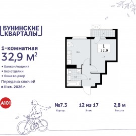 Однокомнатная квартира в ЖК "Бунинские кварталы" на 12 этаже. Квартира без отделки, полностью готова к чистовой отделке и дальнейшему ремонту. Общая площадь: 32.9 кв.м., жилая: 12.7 кв.м., площадь просторной кухни-столовой: 9.8 кв.м. Все окна выходят на одну сторону. В квартире одна...