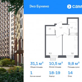 Строим кварталы для жизни с заботой о будущем. Предлагается 1-комнатная квартира комфорт-класса 31, 1 кв.м в корпусе 18-19 на 14 этаже, в ЖК «Эко Бунино» Квартира без отделки. Доступность опции «отделка» и возможность комплектации мебелью и декором уточняйте у...