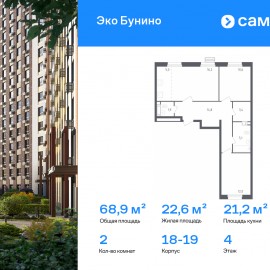 Строим кварталы для жизни с заботой о будущем. Предлагается 2-комнатная квартира комфорт-класса 68, 8 кв.м в корпусе 18-19 на 16 этаже, в ЖК «Эко Бунино» Квартира без отделки. Доступность опции «отделка» и возможность комплектации мебелью и декором уточняйте у...