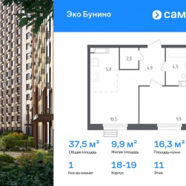 Строим кварталы для жизни с заботой о будущем. Предлагается 1-комнатная квартира комфорт-класса 37, 5 кв.м в корпусе 18-19 на 11 этаже, в ЖК «Эко Бунино» Квартира без отделки. Доступность опции «отделка» и возможность комплектации мебелью и декором уточняйте у...