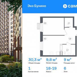 Строим кварталы для жизни с заботой о будущем. Предлагается 1-комнатная квартира комфорт-класса 30, 3 кв.м в корпусе 18-19 на 6 этаже, в ЖК «Эко Бунино» Квартира без отделки. Доступность опции «отделка» и возможность комплектации мебелью и декором уточняйте у...