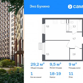 Строим кварталы для жизни с заботой о будущем. Предлагается 1-комнатная квартира комфорт-класса 29, 2 кв.м в корпусе 18-19 на 11 этаже, в ЖК «Эко Бунино» Квартира без отделки. Доступность опции «отделка» и возможность комплектации мебелью и декором уточняйте у...