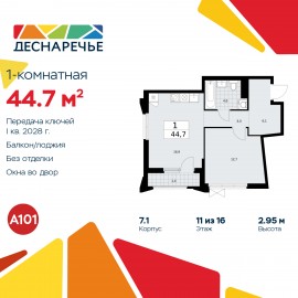 1-комн. квартира от застройщика в ЖК "Деснаречье" на 7 этаже. Квартира без отделки, полностью готова к ремонту. Общая площадь: 44.8 кв.м., жилая: 12.7 кв.м., площадь просторной кухни-столовой: 16.9 кв.м. Угловая квартира, идеально подойдет любителям тишины и панорамных видов. В квартире...