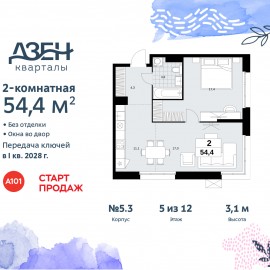 Двухкомнатная квартира бизнес-класса с европланировкой в ЖК "Дзен-кварталы" на 5 этаже. Квартира без отделки, новый владелец может сделать ремонт по индивидуальному дизайн-проекту. Общая площадь: 54.4 кв.м., жилая: 31.8 кв.м., суммарная площадь гостиной-столовой с кухонной зоной:...