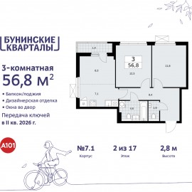 Просторная 3-комн. квартира с европланировкой и отделкой в ЖК "Бунинские кварталы" на 2 этаже. Общая площадь: 56.8 кв.м., жилая: 32.4 кв.м., общая площадь гостиной-столовой с кухонной зоной: 15.4 кв.м. Европланировка, кухня-гостиная - идеальный вариант для тех, кто любит часто принимать...