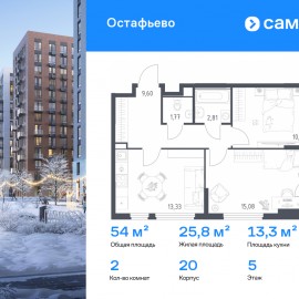 Строим кварталы для жизни с заботой о будущем. Предлагается 2-комнатная квартира комфорт-класса 53, 95 кв.м в корпусе 20 на 5 этаже, в ЖК «Остафьево» Квартира без отделки. Доступность опции «отделка» и возможность комплектации мебелью и декором уточняйте у...