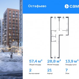 Строим кварталы для жизни с заботой о будущем. Предлагается 2-комнатная квартира комфорт-класса 57, 4 кв.м в корпусе 21 на 7 этаже, в ЖК «Остафьево» Квартира без отделки. Доступность опции «отделка» и возможность комплектации мебелью и декором уточняйте у...