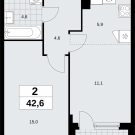 Продается 2-комн. квартира с европланировкой от застройщика в ЖК "Бунинские кварталы" на 17 этаже. Квартира без отделки, новый собственник может сделать ремонт по индивидуальному дизайн-проекту. Общая площадь: 42.6 кв.м., жилая: 26.1 кв.м., общая площадь гостиной-столовой с...