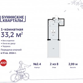 1-комн. квартира-студия от застройщика в ЖК "Бунинские кварталы" на 2 этаже. Квартира без отделки, после выдачи ключей можно делать ремонт. Общая площадь: 33.6 кв.м. Наличие в квартире террасы открывает возможность для создания зон отдыха в кругу семьи и друзей. Высота потолков...