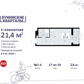 Продается 1-комн. квартира-студия в ЖК "Бунинские кварталы" на 17 этаже. Квартира без отделки, новый собственник может сделать ремонт по индивидуальному дизайн-проекту. Общая площадь: 21.3 кв.м., площадь гостиной 12.7 кв.м., из которых 5.3 кв.м. выделено под кухонную зону. Все окна...