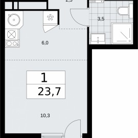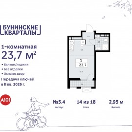 Однокомнатная квартира-студия от застройщика в ЖК "Бунинские кварталы" на 18 этаже. Квартира без отделки, новый собственник может сделать ремонт по индивидуальному дизайн-проекту. Общая площадь: 23.7 кв.м., площадь гостиной 16.3 кв.м., из которых 6 кв.м. выделено под кухонную зону....