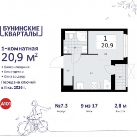 1-комн. квартира-студия в ЖК "Бунинские кварталы" на 9 этаже. Квартира без отделки, после выдачи ключей можно делать ремонт. Общая площадь: 20.9 кв.м., площадь гостиной 14.5 кв.м., из которых 8.2 кв.м. выделено под кухонную зону. Все окна выходят на одну сторону. В квартире одна лоджия,...
