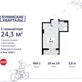 Продается 1-комн. квартира-студия в ЖК "Бунинские кварталы" на 18 этаже. Квартира без отделки, полностью готова к ремонту. Общая площадь: 24.3 кв.м., площадь гостиной 17.1 кв.м., из которых 6.1 кв.м. выделено под кухонную зону. Все окна выходят на одну сторону. В квартире один балкон,...