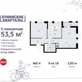 3-комн. квартира с европланировкой от застройщика в ЖК "Бунинские кварталы" на 9 этаже. Квартира без отделки, после выдачи ключей можно делать ремонт. Общая площадь: 53.5 кв.м., жилая: 30.9 кв.м., суммарная площадь гостиной-столовой с кухонной зоной: 17.2 кв.м. Европланировка, зона...