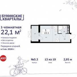 Продается 1-комн. квартира-студия в ЖК "Бунинские кварталы" на 13 этаже. Квартира без отделки, новый владелец может сделать ремонт по индивидуальному дизайн-проекту. Общая площадь: 22.1 кв.м., площадь гостиной 12.9 кв.м., из которых 4.2 кв.м. выделено под кухонную зону. Все окна...