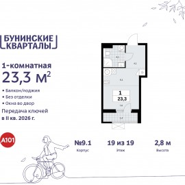 1-комн. квартира-студия от застройщика в ЖК "Бунинские кварталы" на 19 этаже. Квартира без отделки, полностью готова к чистовой отделке и дальнейшему ремонту. Общая площадь: 23.3 кв.м., площадь гостиной 13.7 кв.м., из которых 6.1 кв.м. выделено под кухонную зону. Все окна выходят на...