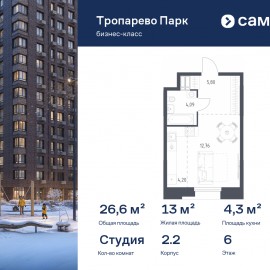 Строим кварталы для жизни с заботой о будущем. Предлагаются апартаменты студия бизнес-класса 26, 59 кв.м в корпусе 2.2 на 6 этаже, в МФК «Тропарево Парк» Апартаменты с чистовой отделкой. Доступность дополнительных опций уточняйте у застройщика. Прописка не предусмотрена в...